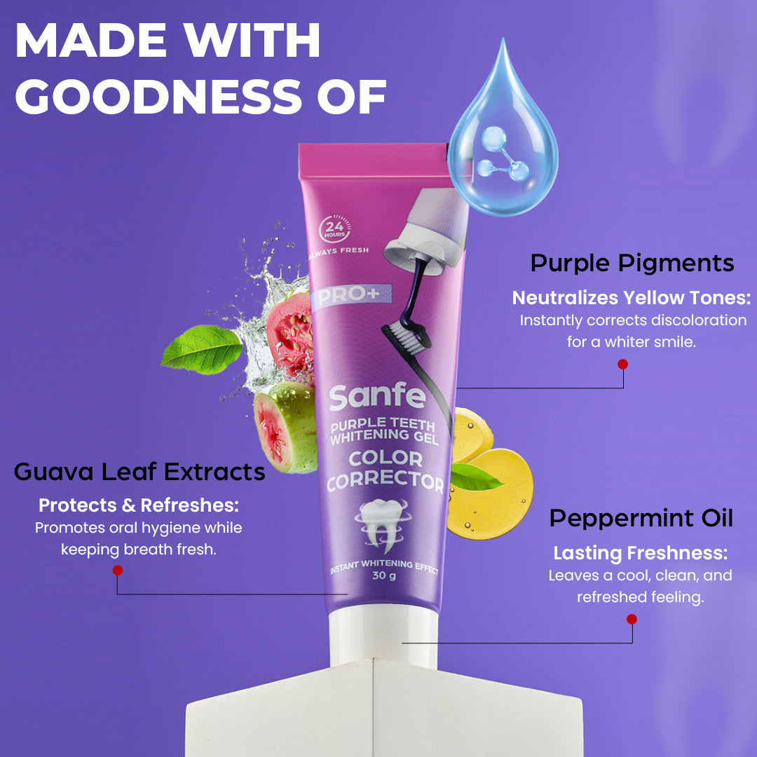 Say goodbye to stubborn stains and yellow teeth with the Advanced Instant Teeth Brightening Combo — a powerful at-home whitening solution combining Purple Teeth Whitening Gel (Pack of 2) and Sanfe Teeth Whitening Strips (14 Pairs). Designed for instant results without sensitivity, this combo lifts surface stains, neutralizes yellow tones, and enhances natural tooth brightness from the very first use.