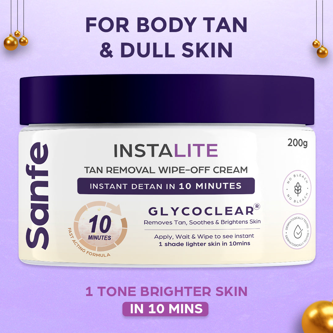 Sanfe Instalite Wipe Off Body Cream tan removal mask is a gentle and effective solution for removing stubborn sun tan. More than 90% of women have seen visible results within 10 minutes. Normal Body lotions & detan masks fail to remove stubborn Body tanning and thus Sanfe has come with a dermatologically approved Body Cream tan removal mask with GLYCOCLEAR technology, enriched with a unique and soothing combination of 5% Glycolic Acid, 4% Niacinamide, 2% Lactic Acid, & 2% Kojic Acid. Use once a week for desired results. Now Body the sun without fear of tan!