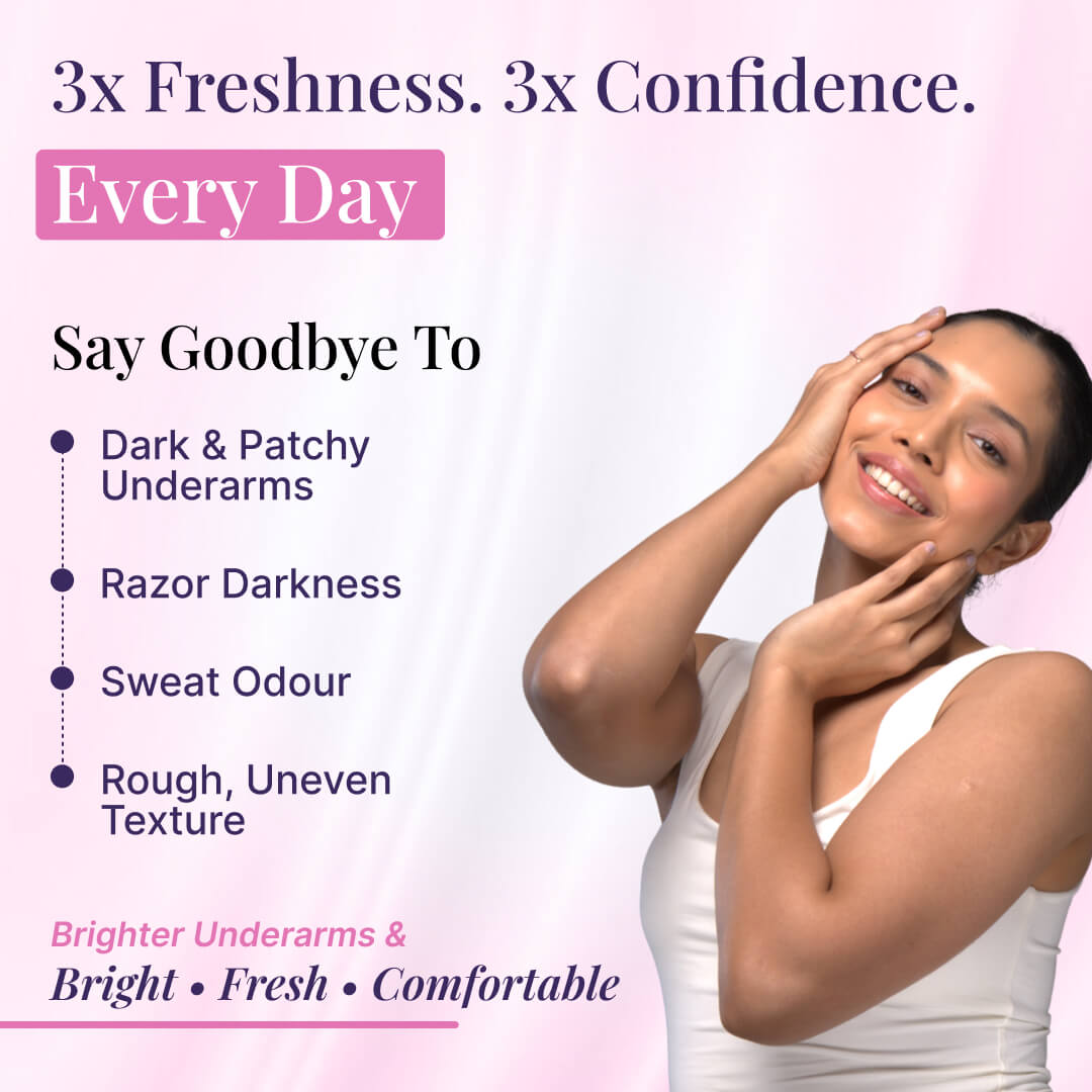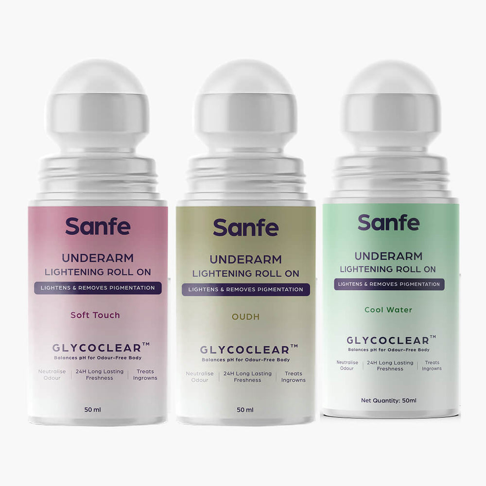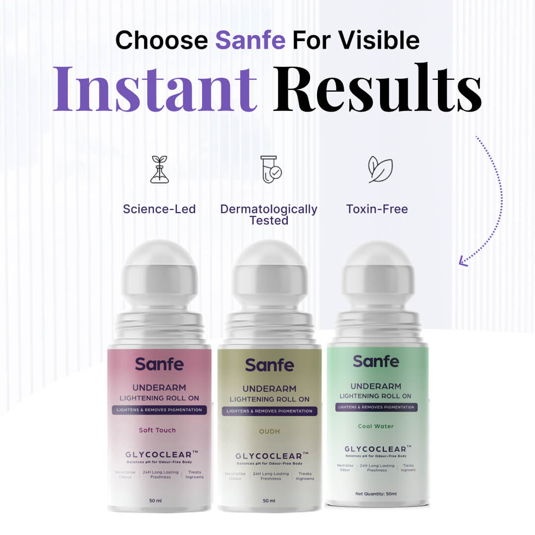 Introducing Sanfe Underarm Lightening Roll On for women, this underarm deodorant ultimate solution for flawless underarms and body folds. This innovative deo roll-on lightens pigmentation, powered by Glycoclear Technology. It neutralizes odor-causing bacteria for all-day freshness. With 24-hour protection against sweat and odor, it treats ingrown hairs too. Say goodbye to dark underarms and hello to brighter, smoother confidence. Embrace flawless underarms with Sanfe Lightening Roll On and enjoy a new level of care.