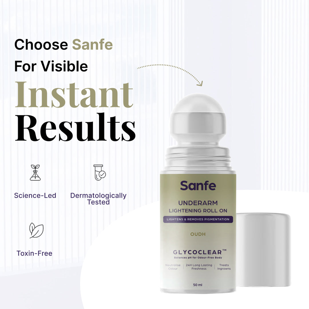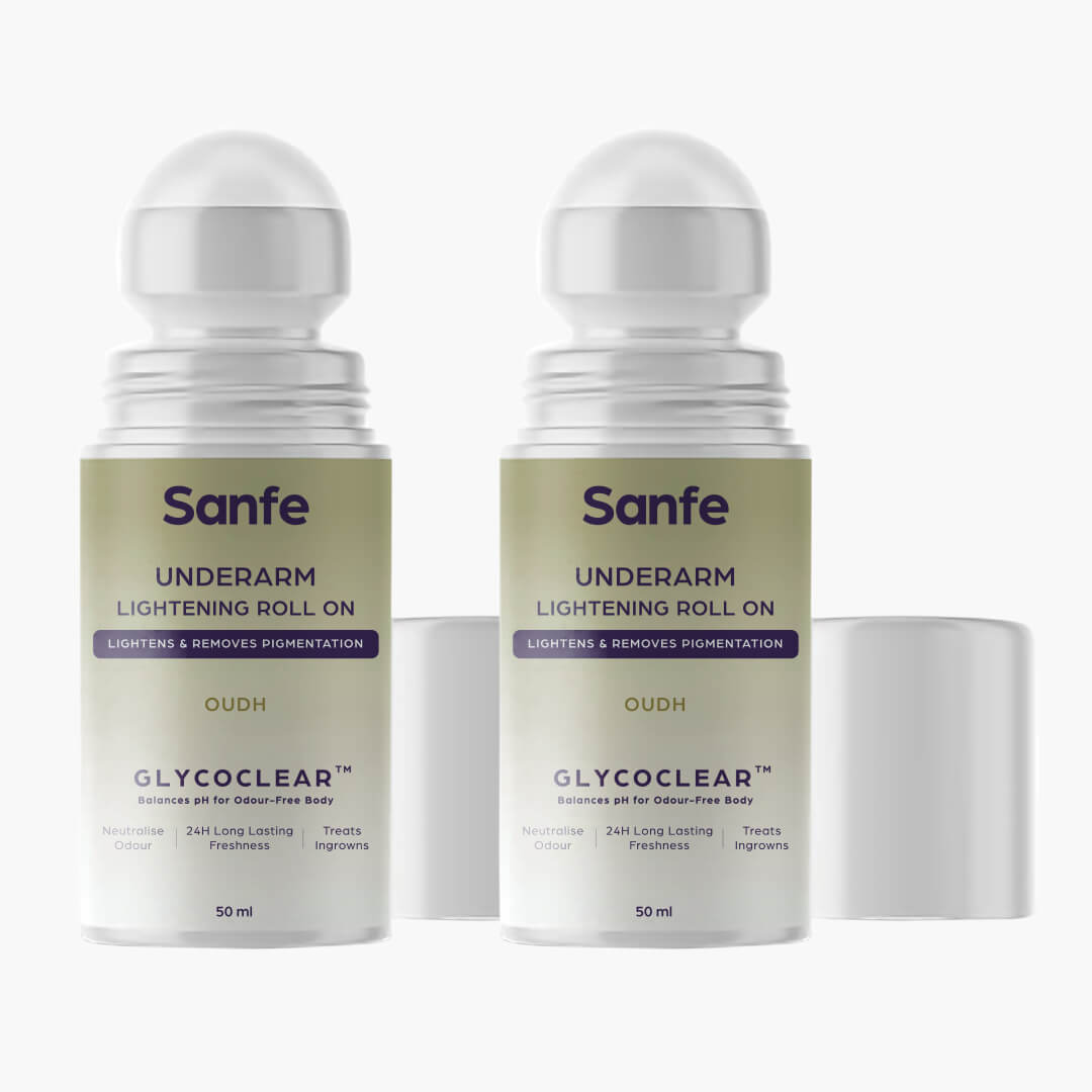 Introducing Sanfe Underarm Lightening Roll On for women, this underarm deodorant ultimate solution for flawless underarms and body folds. This innovative deo roll-on lightens pigmentation, powered by Glycoclear Technology. It neutralizes odor-causing bacteria for all-day freshness. With 24-hour protection against sweat and odor, it treats ingrown hairs too. Say goodbye to dark underarms and hello to brighter, smoother confidence. Embrace flawless underarms with Sanfe Lightening Roll On and enjoy a new level of care.