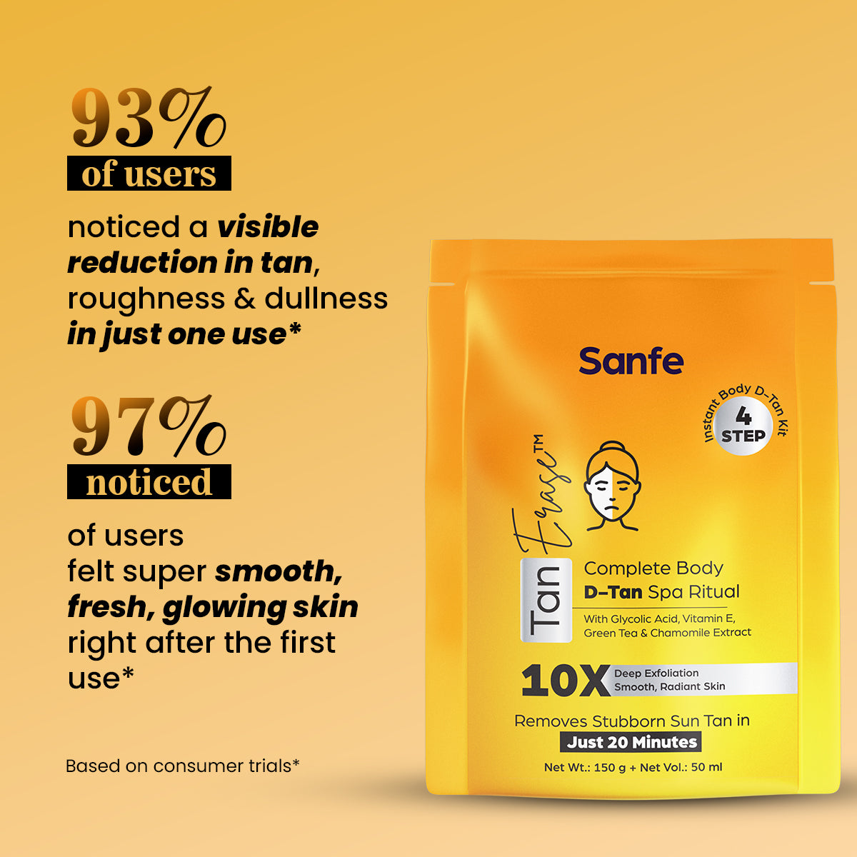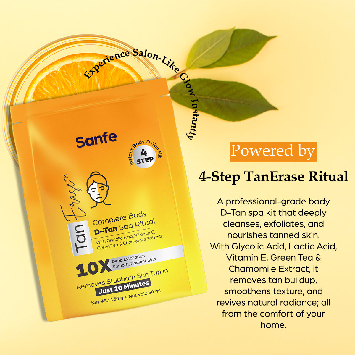 Sanfe Tan Erase Complete Body D-Tan Kit is a 4-step spa ritual designed to remove stubborn sun tan and restore smooth, radiant skin in just 20 minutes. Inspired by professional body detan treatments, the kit combines cleansing, exfoliation, and nourishment into an easy at-home routine.
