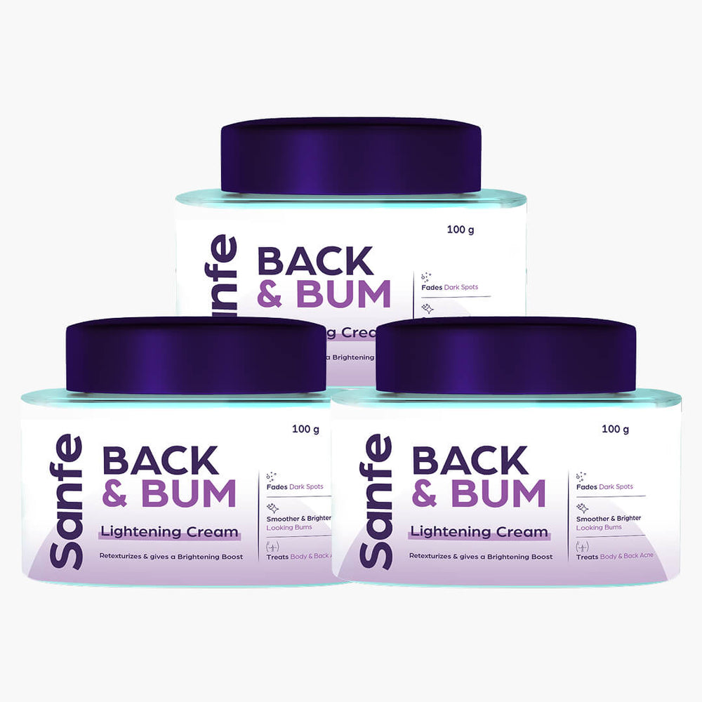 Sanfe Back & Bum Lightening Cream is a skin-brightening cream for dark spots, pigmentation, and body acne on the back and buttocks. It helps improve skin texture, reduce blemishes, and promote a more even skin tone.
