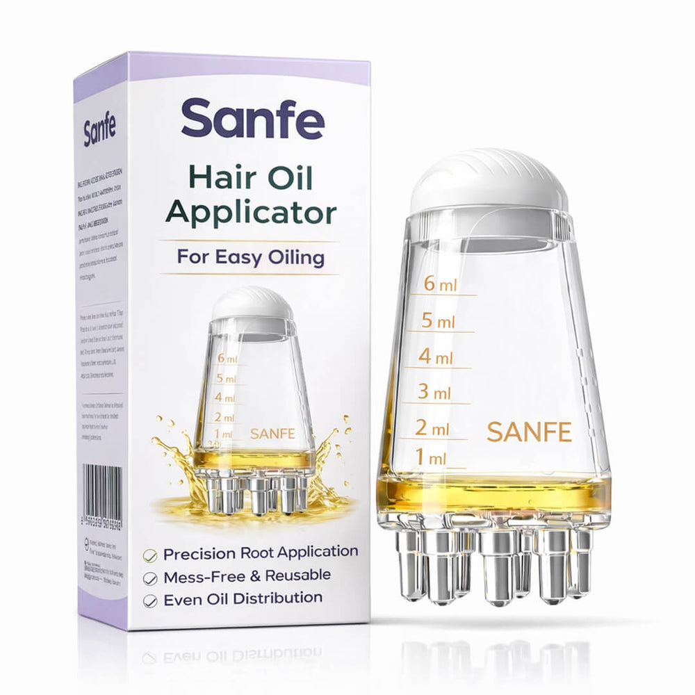 It's a precision nozzle-tip applicator bottle that lets you apply hair oil directly to your scalp and roots — not just on top of your hair. The pointed nozzle parts the hair as you move it, depositing oil exactly where it needs to go. No mess, no guesswork, no wasted product.