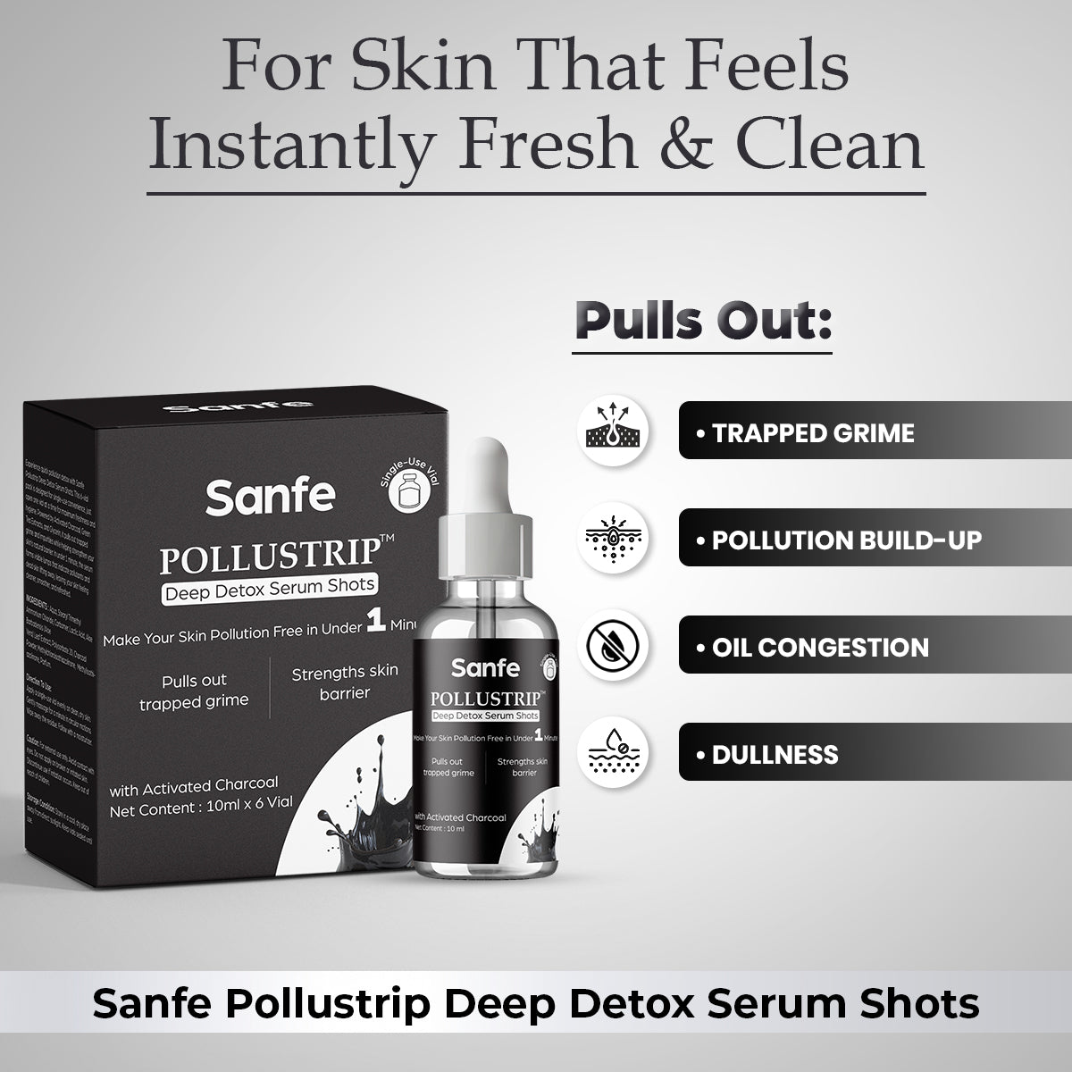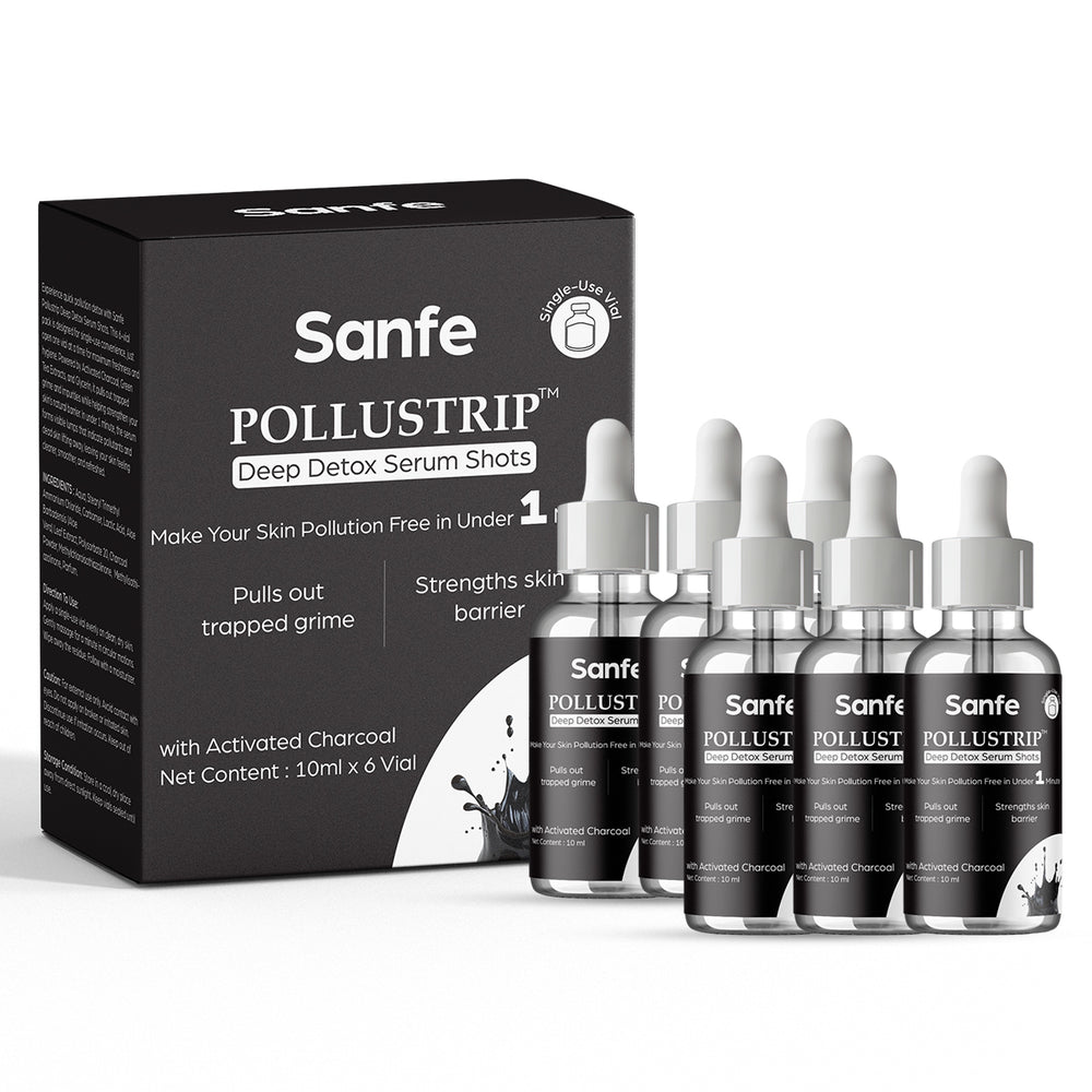 The Sanfe PolluStrip Deep Detox Serum Shots give your skin an instant pollution cleanse in just 1 minute. Powered by activated charcoal, the serum starts pulling out trapped grime, dust, sweat, and pollution the moment you apply it. It reaches deep into clogged pores and lifts out everything that makes your skin look dull and tired.
