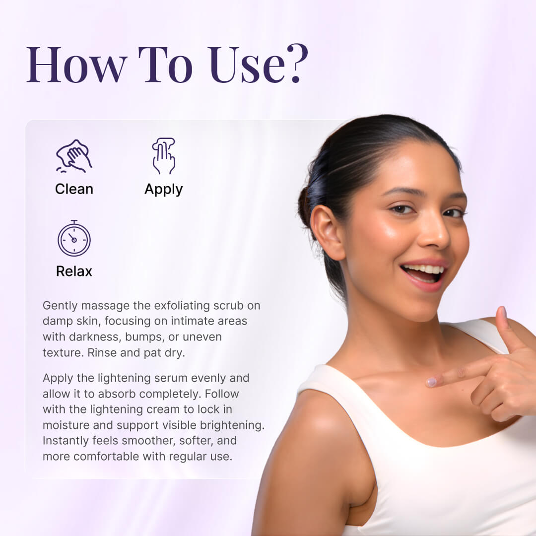 This is a complete solution to your intimate skin darkness. I have been using this kit for almost a year and my skin has transformed for good. My bum and inner thigh area are even toned and I can wear shorts without being conscious. I use the scrub twice a week and use the cream and serum twice a day. It made my skin even toned and improved its texture.