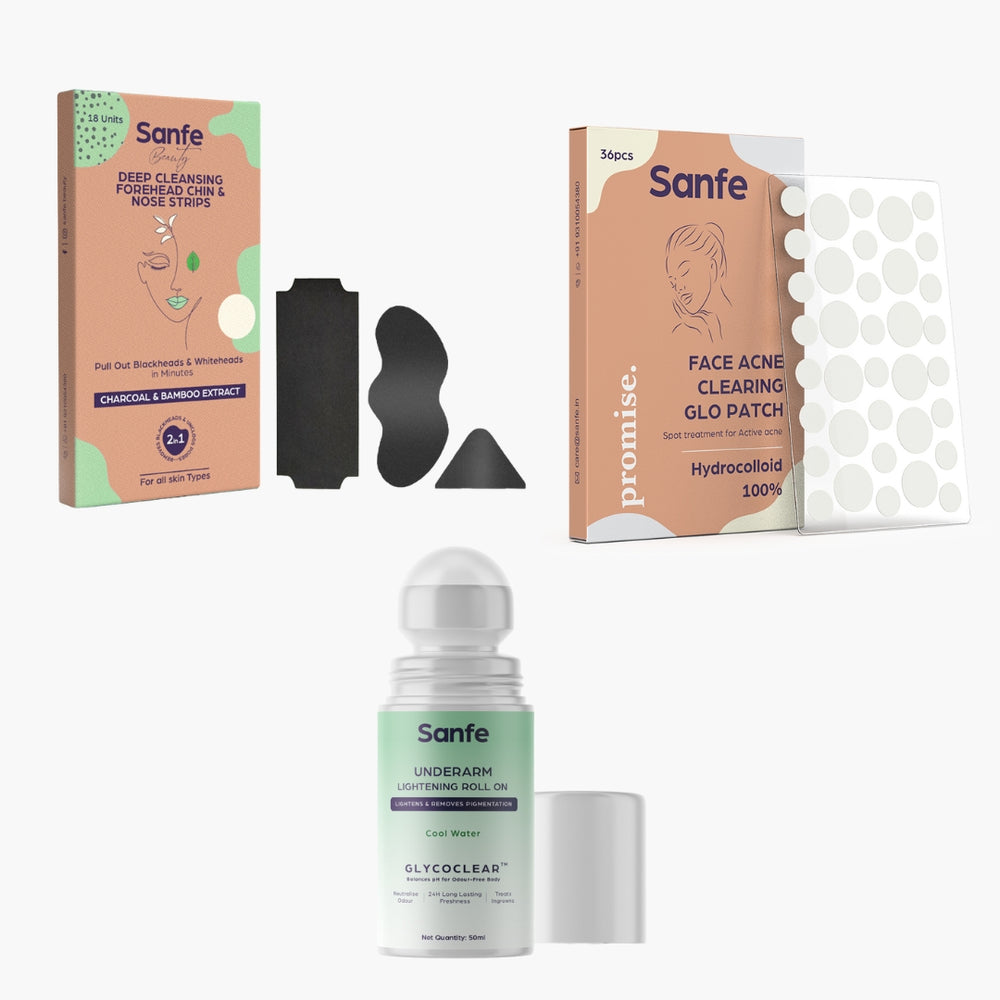Sanfe Complete Acne & Brightening Care Combo | Glo Patch, Blackhead Removal Strips & Underarm Lightening Roll-On