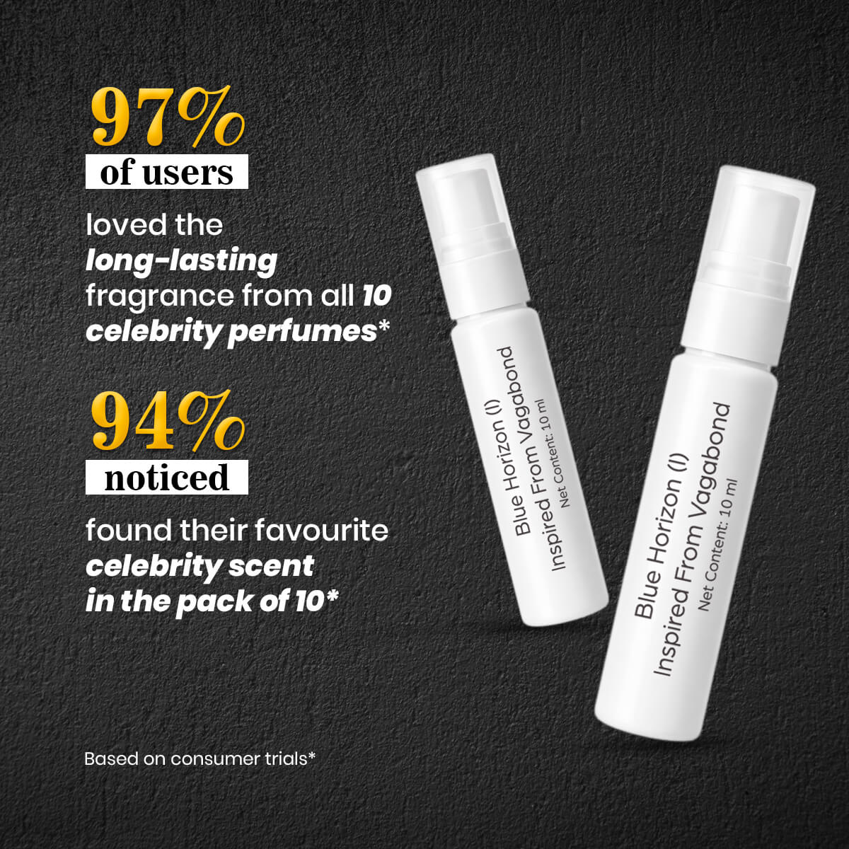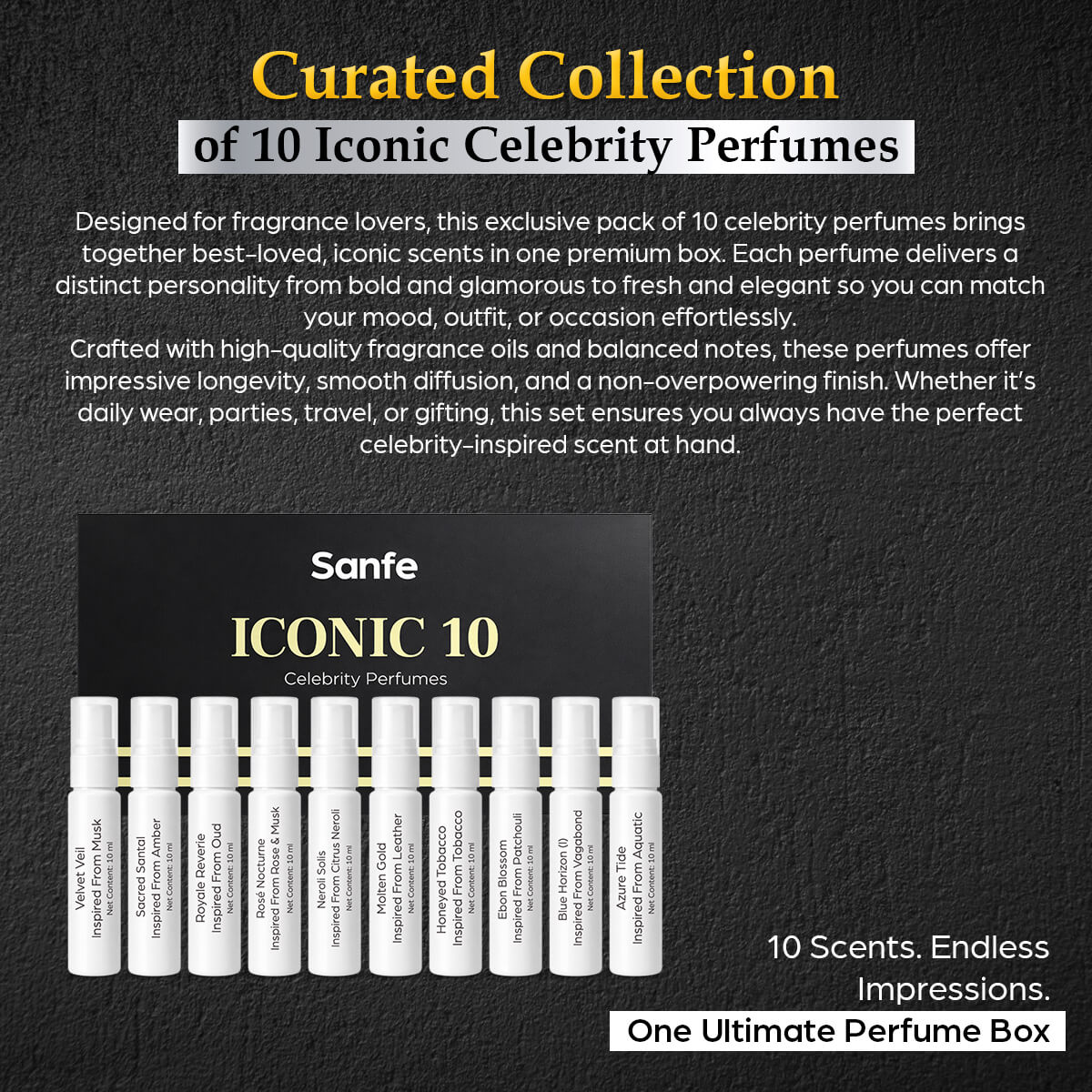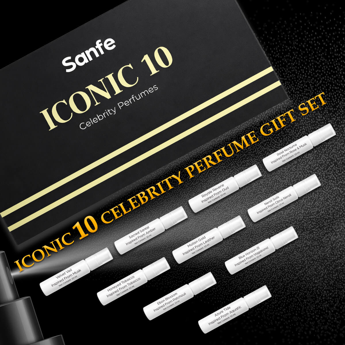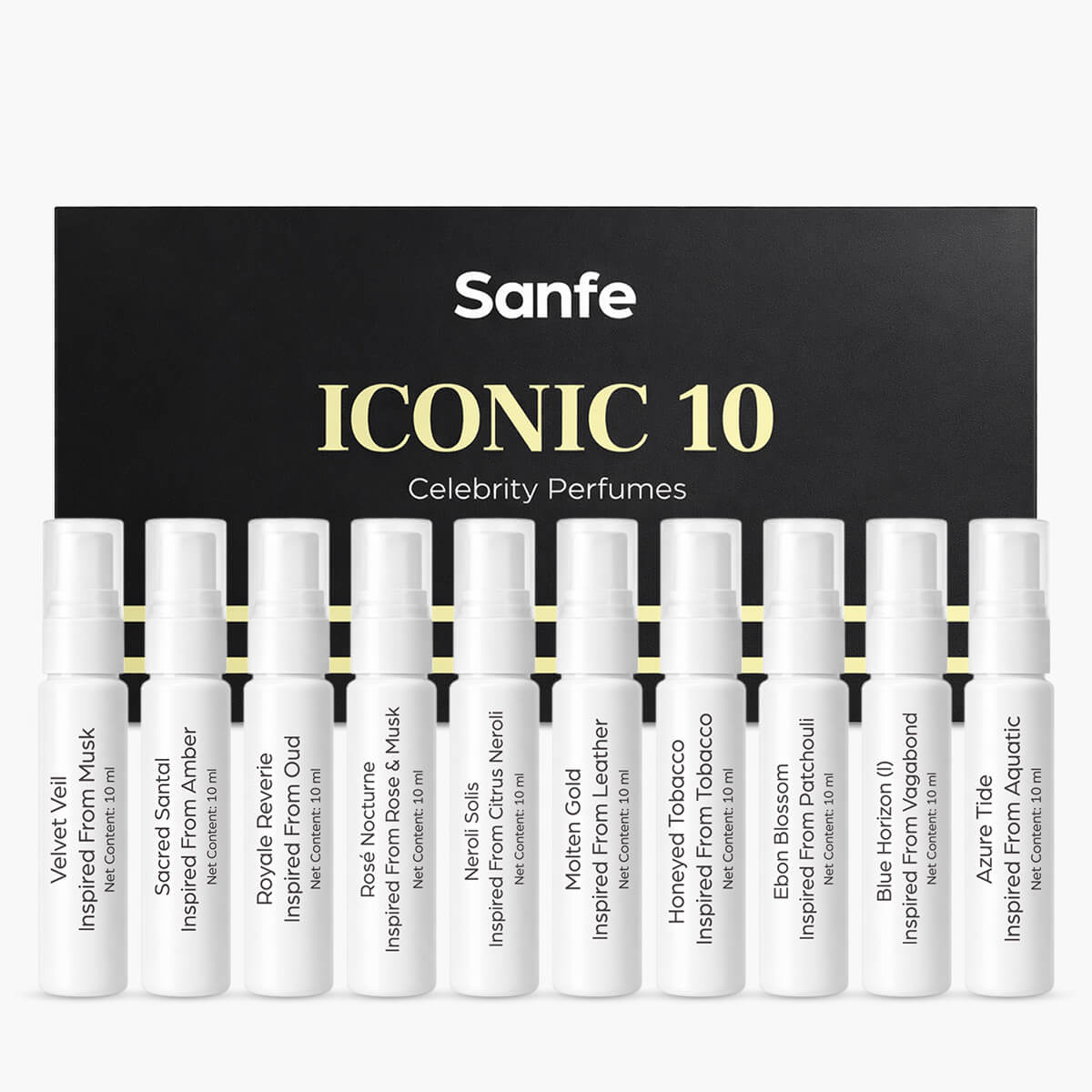 ICONIC 10 by Sanfe is a curated set of 10 signature perfumes inspired by celebrity-loved fragrance styles from around the world. Each scent captures a unique mood and personality, ranging from warm ambers, rich ouds, and deep musks to fresh aquatics, refined florals, and vibrant citrus blends.